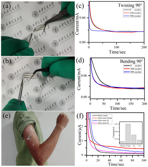Optical images of (a) twisting 90°, (b) bending 90° and (e) human real sweat measuring method. Amperometric response of the composite films by 0.5 mM glucose concentration with (c) twisting and (d) bending 0, 100, and 500 cycle times. (f) Amperometric response of the sensor before meal (−30 min), after meal 30 min, 3 h and 5 h, the normalized amperometric response shown as insert graph.