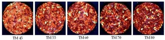 The patties for the econo burger/budget burger category (Figure 4) were manufactured from beef meat, beef fat (10% added) and MRM (added at different percentages), with a TM content ≥35% and a minimum TME of 55%. These patties may also contain other added ingredients as stated in the regulation (Table S3). For this formulation, the beef fat, spices and TVP were kept constant across the treatments, with the beef meat, MRM, water, soya fibre and burger rusk varying for each treatment. The treatments with a TM% and a TME% above 35% and 55%, respectively, were the authentic patties, with the treatments below these limits resulting in the adulterated patties.