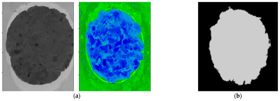 (a) A hyperspectral (greyscale and spectral) image of a pure beef burger patty; (b) A binary mask image created using thresholding at 952 nm with a value of 1.1.