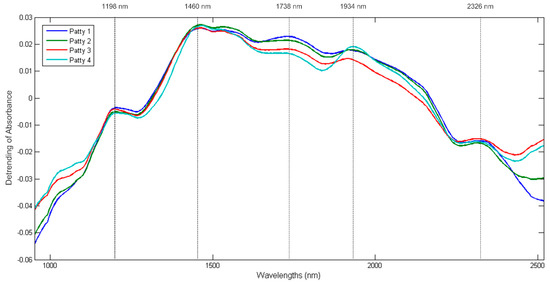 Baseline corrected (detrending) mean pseudo-absorbance spectra for Patty 1 (blue), Patty 2 (green), Patty 3 (red) and Patty 4 (turquoise); Five prominent absorption bands were observed at 1198 (fat), 1460 (moisture), 1738 (fat), 1934 (moisture) and 2326 nm (protein).