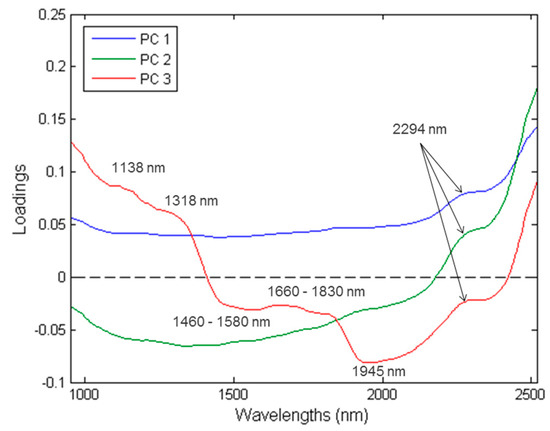 PCA loadings line plot for PC1 (blue), PC2 (green) and PC3 (red) with interpretable bands at 1138, 1318, 1460–1580, 1660–1830, 1945 and 2294 nm.