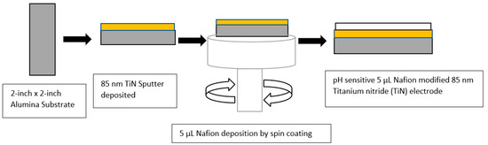 This section records the detailed step-by-step fabrication process of TiN + Nafion electrodes. The key performance indicators of pH sensors, such as sensitivity, drift, and hysteresis, are explained and reported in this section of the paper. Finally, the TiN + Nafion electrode was applied in real high-redox sample varieties to test the performance and validate the role of Nafion modification to TiN pH sensors.