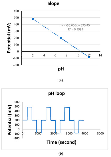 Electrode sensitivity, or the theoretical Nernst response at 22 °C, is defined as the value of 58.3 mV. When n = 1 in Equation (3), all pH-sensitive electrodes at the specified temperature should have the same sensitivity value; however, the theoretical response, in practice, will deviate from this value [33,34].