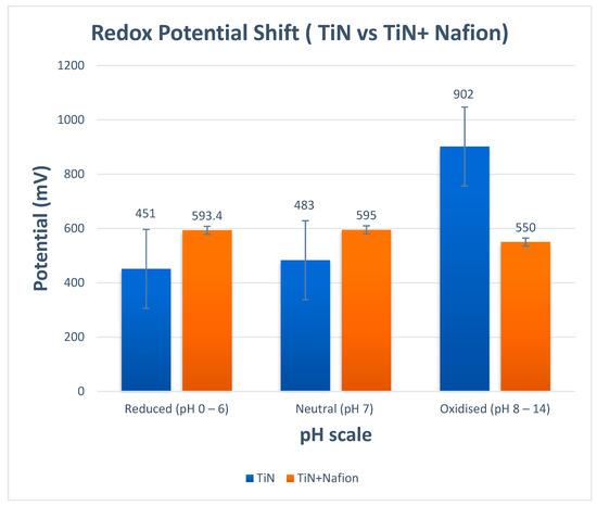 Metal oxide pH electrodes were once an alternative to glass pH electrodes [11,12,13,14]. IrO2-based pH electrodes and their less popular RuO2-based counterparts have both been the subject of extensive research [12]. Metal oxides’ primary flaw is their redox sensitivity [15]. This redox sensitivity has a negative impact on the electrode potential in the neutral region and, consequently, limits the use of these materials as sensors [16]. The disruption of reducing or oxidizing species causes this constraint to be most noticeable in potentiometric metal oxide electrodes. Fog and Buck [17] claim that RuO2 exhibits significant changes in redox agents. However, they also state that other iron oxides, such as IrO2, do not retain a Nernstian pH response above half the pH range when there are oxidizing or reducing agents [6,9]. It is interesting to note that this claim was only superficially addressed in their 1984 book and has not been adequately explored in the literature. To address this issue, other researchers investigated the use of Nafion to modify pH electrodes, such as an IrO2 sensor [18], and they were successful in minimizing electrode potential shift in the neutral pH range. It was demonstrated in previously published work that adding protective layers of Ta2O5 [13] and Nafion [19,20] to a RuO2 pH electrode lowers the redox interference and gives more accurate pH values of some samples, such as beer [11]. These modified electrodes, however, were still ineffective for samples such as wine and fresh citrus juice [11]. In this study, not only has it been possible to develop a sensor that is highly accurate in samples, but also has an improvement with a small potential shift of 2 mV, when compared to a RuO2 sensor, which has a shift of 300 mV, and an unmodified TiN sensor with a shift of 30 mV in reducing conditions [21,22]. Having overcome the redox interference in metal nitride pH sensors now allows for the possibility of replacing the glass electrode in applications where the size of the electrode and robustness are crucial, and where there is a need for low production costs [23,24,25,26,27].