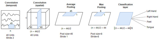 c is the number of EEG channels. The first convolution applies a temporal convolution with a