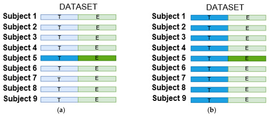 In all experiments, a repeated holdout validation over the same testing set was carried out, considering both subject-specific and non-subject-specific classification strategies. For each repetition, a subset of the training set was randomly picked, guaranteeing identical class ratios in with respect to the class ratios in . The subset was used for validation purposes, which is necessary to build deep learning models. For training purposes, the remaining set was used. Once the model was trained for each pair and , it was evaluated on the testing set . To reduce the influence of random factors, this process was repeated 16 times for each model, reporting the average of some metrics, such as accuracy, , among others.