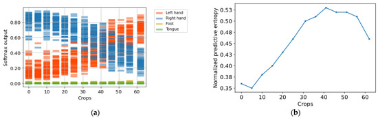 Figure 6a shows the predictive distribution histograms of crops over a specific trial on Subject A01 from dataset 2a, where the initial crops were classified correctly as left-hand MI, but after approximately crop number 45, they were incorrectly predicted as right-hand MI.