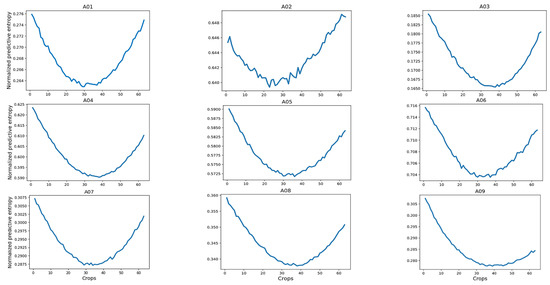 Figure 7 shows the normalized predictive entropy on a validation set from database 2a. We observed that the central crops covering a time interval from 1.724 to 5.756 s regularly presented the lowest uncertainty with respect to the crops located at the extremes. It is worth mentioning that this finding was also observed in dataset 2b.