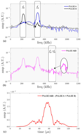 wave fields, and , at point are shown in Figure 2c. Maximum interaction occurs, with the maximum displacement of both incident pulses occurring just after 50 µs. Figure 2d shows the frequency spectra of the component for the three simulation cases, which correspond to wavefields , , and . The displayed frequency spectra show the excitation frequencies acting separately as well as concurrently. From this stage, the subtraction technique is required to extract the component using Equations (8) and (9).
