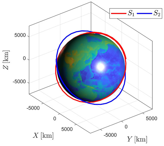 An example with two spacecraft in circle orbits is considered. The nominal orbit elements are listed in Table 1, and the corresponding orbits are shown in Figure 2. The elements h, e, i, , , and n denote the orbit altitude, eccentricity, inclination, longitude of the ascending node, and argument of the periapse and true anomaly, respectively. The semimajor axis a is computed by , where is the radius of the Earth.