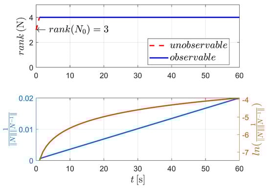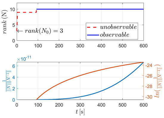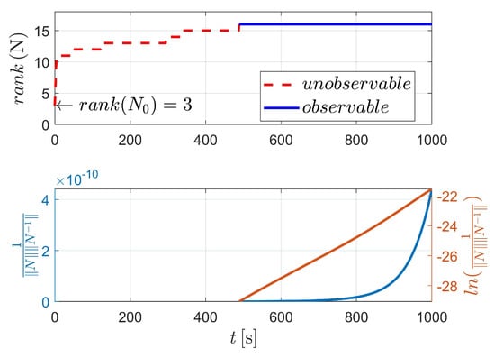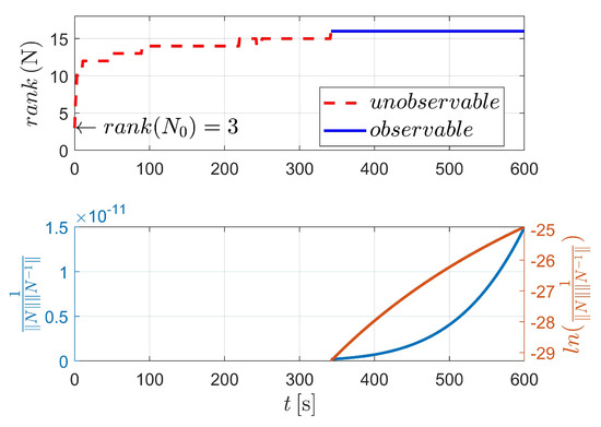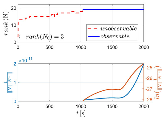 Figure 3 displays the observability results of case I, using the two-body dynamics (state model as Equation (3)). For case I, 60 measurements (equivalent to 60 s) are executed during the navigation process. As shown in Figure 3, the upper stacked subplot illustrates the rank of the observability matrix (OM), where the red line represents the unobservable period (i.e., ) and the blue line represents the observable period (i.e., ). Moreover, the lower stacked subplot demonstrates the condition number (CN) of OM (note that in Figure 3, the y-label represents the reciprocal of CN). In addition, the logarithmic value of the reciprocal of CN is also given in the lower stacked subplot, making the change curve of CN more obvious. Figure 3 shows that the CN deceases with respect to the observation time, which means that the observability of the system continuously improves as the number of measurements increases.