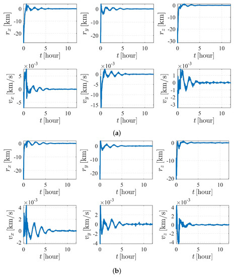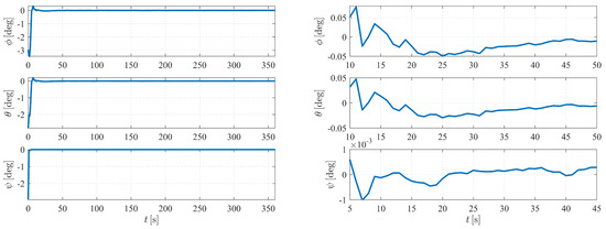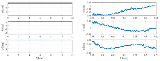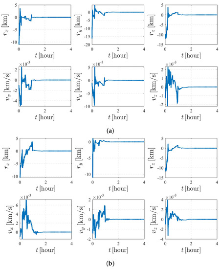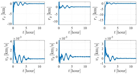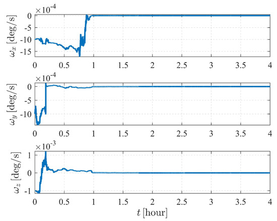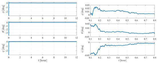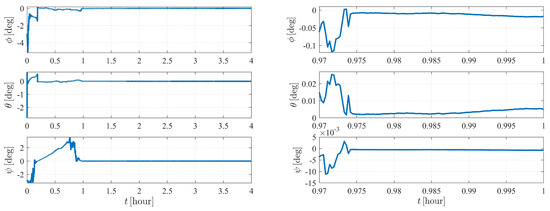 Note that the system is sensitive to the attitude and the angular velocity of ; hence, for case V, the numerical observability measures are computed from the initial simulation epoch to the end of the simulation (within a total of 4 h) with a measurement frequency of 1 per 0.5 s. The results are illustrated in Figure 19, Figure 20 and Figure 21. Figure 19 and Figure 21 show that the attitude and the angular velocity converge at approximately 1 h, while as expected, the orbit states converge at approximately 2 h (Figure 20).