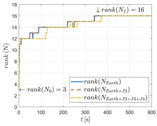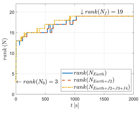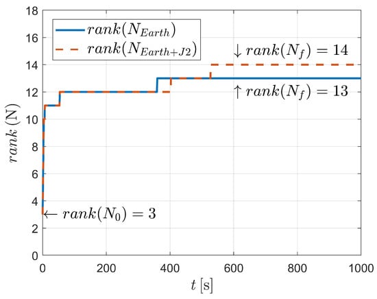 Observability analysis is necessary to determine whether a particular measurement system is sufficient to solve the state estimation problem [34,35,36], and a number of researchers have carried out this analysis in the context of the OD problem [37,38,39]. One unwieldy approach to establish observability is to use classical nonlinear techniques that rely on Lie-derivative criterion methods [24,25]. In general, it is difficult to provide further results on the system observability based on the Lie derivative criterion because the analytical expressions of higher-order Lie derivatives become progressively more complicated. Hence, discussing observability for nonlinear systems using Lie algebra and differential geometry methods becomes quite difficult. Another type of approach for establishing observability is the observability matrix (OM) [1,11]. The OM method can be used to determine whether a system can be observed using sequential measurements, which are easy to obtain through numerical propagation.