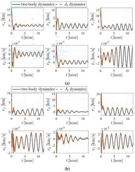 As indicated in Table 5, only 344 measurements are needed to observe the 16 variables, which is less than that of case III (situation considering , , and perturbations in Table 4). Furthermore, at time epoch , which is difficult to observe in case III, the CN of the system is larger than that of case IV (for case III, as shown in Table 4, , while for case IV, listed in Table 5, ), indicating that compared to the perturbation acceleration, a suitable attitude maneuver is more likely to attach obvious improvement to the observability of the two-spacecraft system.