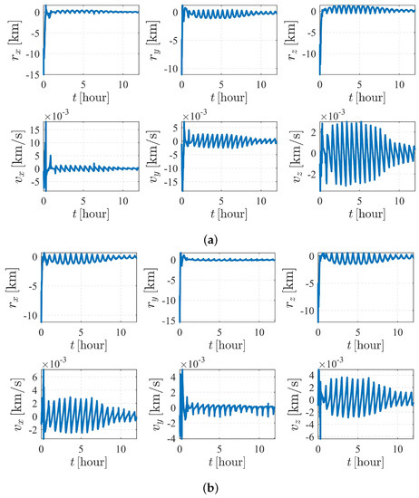In this case, the orbits of and as well as the attitude of are estimated. The only information for the navigation system is that . Therefore, the state to be estimated is: