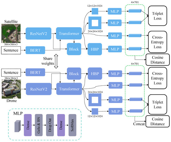 Overview of the proposed method. MBF contains two branches, i.e., the satellite-view branch, and the drone-view branch, respectively, to process different inputs. The above two branches share weights since their patterns are similar. Given one image, ResNet first extracts its feature map. Then, the semantic feature from BERT is input to the Transformer block with the map. (See Figure 3). Next, HBP (See Figure 4) and Partition Strategy are applied to the output of the backbone (Block stands Transformer block). Finally, all these feature descriptors are fed into MLP to calculate loss or distance.