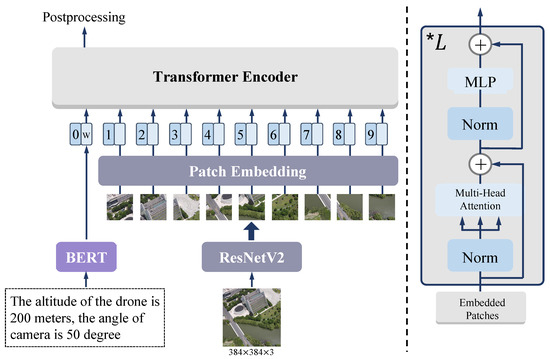 The architecture details of Multimodal block. On the left side of the picture, the descriptive sentence is transformed to word embedding using BERT and aligned with image patch embeddings. Then, those embeddings are fed into Transformer Encoder to extract deeper features. On the right side of the picture, the Transformer block’s detailed architecture is shown.
