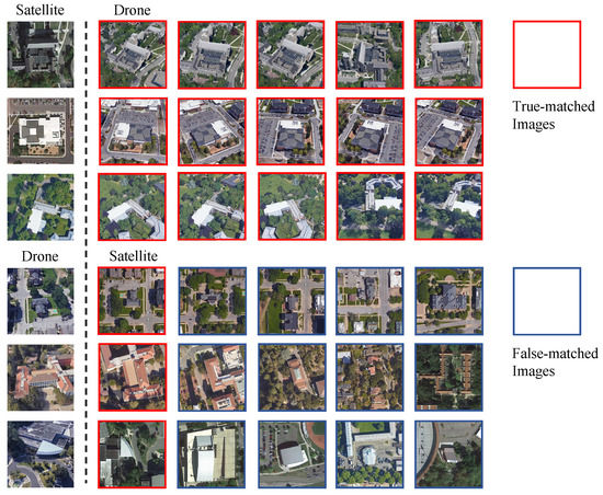 Another dataset implemented in experiments is SUES-200, released by Zhu et al. [43]. SUES-200 is also a cross-view matching dataset with only two views, drone-view and satellite-view. It pays attention to the flying height of the drone and selects a boarder range of scene types. There are four heights in SUES-200, 150 m, 200 m, 250 m, and 300 m. In addition, the camera angles at the four heights are 45°, 50°, 60°, and 70°. Concretely, SUES-200 collected 50 images for drone-view and one image for satellite-view at each location. The drone-view images were captured by the drone in the real world, and the flight trajectory is one circle around the target scene with a fixed height. The satellite images were collected from AutoNavi and Bing Maps in corresponding target locations.