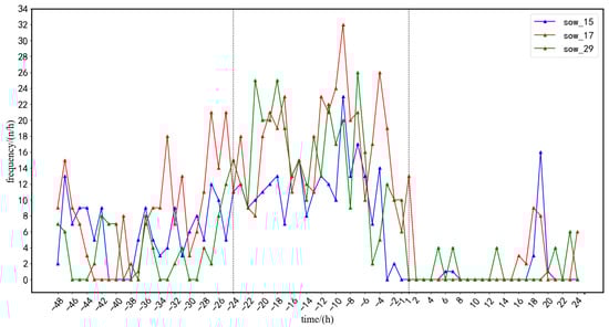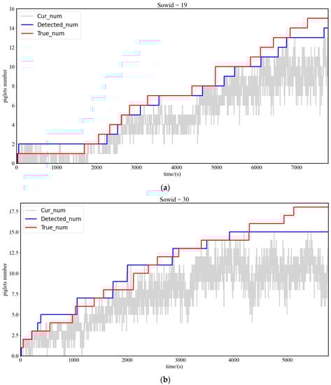 - According to the changes in the frequency of sow posture transitions output by the model, early warnings were sent 5 h before the onset of farrowing, with an average error of 1.02 h between the warning time and the actual farrowing time. Alarms for sow farrowing were sent using the approach of “three consecutive detections” for the first newborn piglet, and the piglet number was determined according to the number of newborn piglets detected.