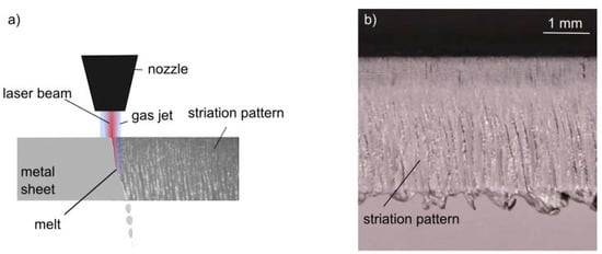 (a) Basic principle of laser beam fusion cutting of metals: the material is molten by the laser beam and accelerated by the gas jet. (b) Resulting cutting kerf with characteristic striation pattern.