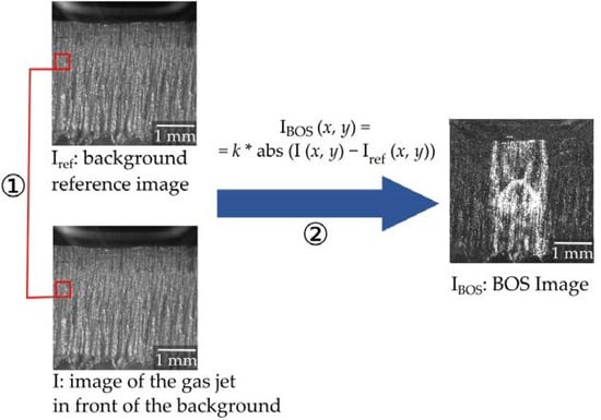 Imaging of gas jets from cutting nozzles was conducted in [6] with a classical Schlieren imaging technique. There are various setups for Schlieren imaging. They are all based on the effect of the distortion of light rays, which occurs when light is sent through a volume of interest, where different refraction indices are present. Schlieren imaging can be used for the observation of gas jets as the different pressures in the gas jet cause slightly different refraction indices. Classical Schlieren setups are based on an optical setup, consisting of mirrors or lenses and requiring space around the specimen, where the Schlieren effect can be observed due to a change in path as the light passes through the medium and the Schlieren image is directly generated at a screen or camera sensor. In this study, background-oriented Schlieren imaging (BOS) was used, which is described in detail in Section 2.1. This allows for a simpler setup without additional mirrors or lenses but relies on algorithmic postprocessing of the images.