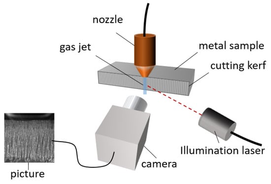 The basic imaging setup is shown in Figure 4. It consists of imaging equipment (camera and illumination), a background pattern (the striation pattern of a cutting kerf), and the Schlieren object (the gas jet from a cutting nozzle). In the experiments, a high-speed camera (Phantom v1210, Vision Research Ltd., Wayne, NJ, USA) and an illumination laser (CAVILUX HF, Cavilux) for high-speed imaging were used to investigate the possibilities for observations of highly dynamic effects with this imaging technique. The nozzle is positioned in such a way that the gas flows directly next to the cutting kerf; the exact positioning depends on the respective experiment and is described in the following experiment descriptions.