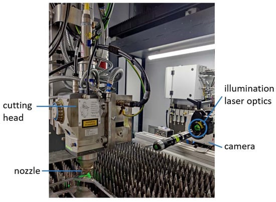 As imaging of shock fronts was possible with the experimental observation setup 1, the camera and illumination laser were subsequently integrated into an industrial cutting application setup (setup 2; see Figure 5). For this, the ERLAS laser welding and cutting system was used. The system consisted of a TruDisk 8001 laser with a maximal power of 8 kW and an enclosed housing containing the work area, a cutting head with processing optics, and gas supply. With this system, a 3 mm thick AlMg3 metal sheet was cut at a laser power of 3 kW with nitrogen as a process gas at a pressure of 3 bar. After cutting, the enclosure of the machine was opened and the cutoff piece was removed. This was necessary as the cutoff piece was shielding the cutting kerf from the camera. After this step, the cutting kerf was visible for the camera. Subsequently, the nozzle was moved back to the cutting position over the solidified cutting kerf and the gas jet was turned on again. Nitrogen was used as a process gas, at a pressure of 3 bar. In the cutting machine, the alignment of the illumination laser and camera is more difficult, as is the protection from vibrations. Sparkling reflections of the illumination laser light on the metal surface should be avoided in order to obtain BOS images with good resolution. Images were recorded with frame rates of 37,000 fps.