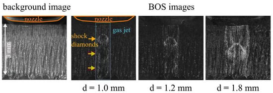 In [6], not only the first shock diamond near the nozzle opening is visible but a whole repeating pattern of shock diamonds in the gas jet. This pattern of repeated shock diamonds becomes increasingly blurry with increasing distance from the nozzle opening. However, the BOS setup proposed in this study is relatively simple compared with the setup in [6], and high-speed BOS with the much shorter integration time of 1 µs was performed in this study.