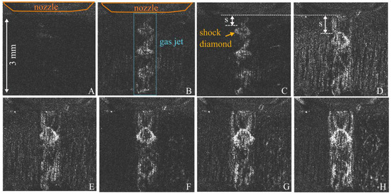 With the proposed imaging setup, the dynamics during the start of the operation of the nozzle can be visualized, as shown in Figure 7. The start of the operation of the 1.2 mm nozzle was recorded at a frame rate of 370,000 fps and an illumination time of 0.5 µs. Fluctuations in the shock fronts of the gas jet are visible (Figure 7B–G) for around 30 ms, followed by a more steady appearance of the gas jet (Figure 7H). In pictures C–H, it becomes visible how the distance between the nozzle and the first shock diamond slightly increases until it reaches its final static position. These results show the feasibility of the proposed BOS method in combination with high-speed imaging.