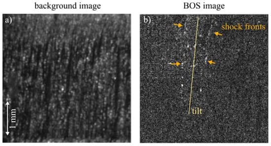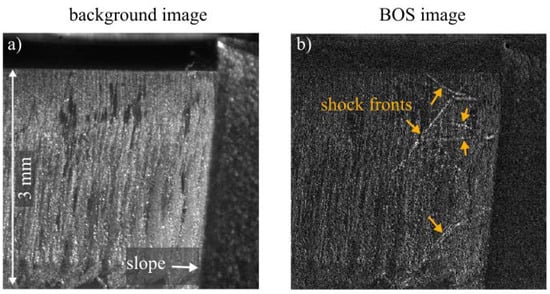 For research on gas dynamics in laser cutting processes, the interaction of the gas jet with the process zone is important. The initial step to investigate this behavior comprises the investigation of a ‘model front’. Therefore, a metal sheet with a sloped edge and a thickness of 1 mm was clamped in front of the background cutting kerf. For these experiments, the nozzle with a 1.8 mm opening diameter was used. As the shock fronts were not visible in the first experiments with a 0.2 µs illumination time, the illumination time was increased to 0.5 µs. This illumination time is still short enough to generate snapshots for the observation of dynamic effects. After the nozzle is turned on, standing shock fronts, like those depicted in Figure 8, build up. The shock fronts resulting from the interaction with the inclined surface differ visibly from the shock fronts of the free jets in Figure 4 and Figure 5. Similar behavior was visible in the experiments in [6], where a glass model and a conventional Schlieren setup utilizing parabolic mirrors was used. In Figure 8, it can be seen that certain irregularities such as the big dark spots at the cutting kerf are also visible in the BOS image and can locally decrease the quality of the BOS image.
