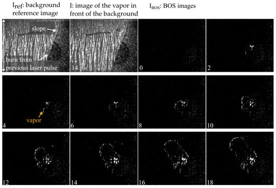The metal evaporation process at the model front was recorded at a frame rate of 73,000 fps with an exposure and illumination time of 1 µs. A slight flickering is directly visible in the recordings. Apart from that, the evaporation is not visible in the recording and only becomes visible in the evaluated BOS images, as shown in Figure 9. For example, BOS image number 14 is calculated from the first two images in Figure 9: the background reference image Iref and image I_14. In I_14, the expansion of the vapor is not discernible; it only becomes visible in the processed BOS image IBOS_14.