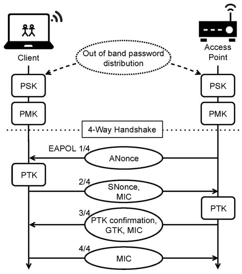 There are several generations of encryption schemes that can be employed on a Wi-Fi connection. WPA version 3 is the most recent and secure [30]. Still, many APs run on WPA2, which has several vulnerabilities associated to it [31,32,33]. WPA2 is based on IEEE 802.11i and was ratified in 2004 [34,35]. It can be further differentiated between its modes Personal and Enterprise, where the latter has a few additional security features. Enterprise mode utilizes an authentication server that administers individual session keys and is designed for larger networks of upwards of 10 stations [36]. The WPA2 Personal is sometimes referred to as PSK mode because the AP authenticates the user and encrypts the connection based on a single key known by all stations in the network [31].