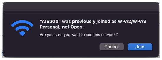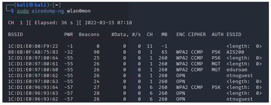 - Etta, V.O.; Sari, A.; Imoize, A.L.; Shukla, P.K.; Alhassan, M. Assessment and Test-case Study of Wi-Fi Security through the Wardriving Technique. Mob. Inf. Syst. 2022, 2022, 7936236. [Google Scholar] [CrossRef]