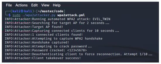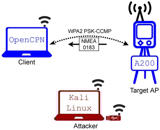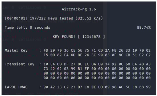 - Radivilova, T.; Hassan, H.A. Test for penetration in Wi-Fi network: Attacks on WPA2-PSK and WPA2-enterprise. In Proceedings of the 2017 International Conference on Information and Telecommunication Technologies and Radio Electronics (UkrMiCo), Odesa, Ukraine, 11–15 September 2017; pp. 1–4. [Google Scholar]