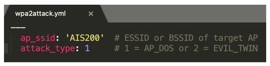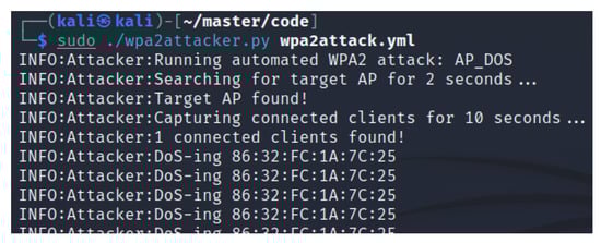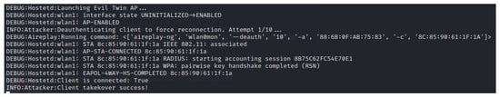 There have been several studies related to WLAN and IoT security. Hossain et al. presented and discussed various security issues and challenges in the IOT, including WLAN connectivity [17]. In 2020, Kristiyanto et al. analyzed a deauthentication attack on a Wi-Fi connected IoT camera [40] equivalent to the DOS attack presented in Section 5.1. Verma et al. demonstrated several serious security risks for IoT devices on connected to IEEE 802.11ah WLAN networks [61]. Vanhoef and Piessens demonstrated that an adversary can force a reinstallation of the key generated during the handshake process, effectively resetting the nonce and replay counters [62]. In WPA2 PSK-CCMP, this would allow the adversary to decrypt and replay frames but not forge new ones. In 2021, Vanhoef discovered more vulnerabilities in both design and common implementations of all WPA versions [63]. With user interaction, an adversary uses the design vulnerability to steal sensitive data. Furthermore, Vanhoef demonstrated how the vulnerabilities could be exploited to attack IoT devices. Over the last years, some tools that automate attacks on the Wi-Fi related vulnerabilities have been developed. Specifically, we know of the “WiFi Exploitation Framework-WEF” [64], “Airgeddon” [65], and “Wifiphisher” [66]. These are all capable of running several attacks on WPA2 including versions of the Evil Twin attack. Yet, to the best of our knowledge, we do not think they are able to fully automate the process of the second attack presented in Section 5.1.