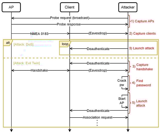 - Bellardo, J.; Savage, S. 802.11 {Denial-of-Service} Attacks: Real Vulnerabilities and Practical Solutions. In Proceedings of the 12th USENIX Security Symposium (USENIX Security 03), Washington, DC, USA, 4–8 August 2003. [Google Scholar]