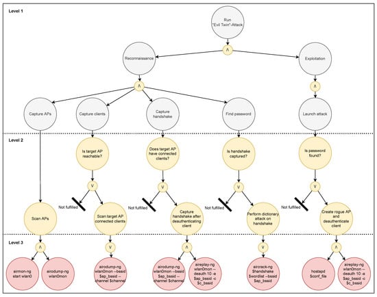 Level 3 contains a single layer of nodes which describes concrete commands. These commands execute the actions described by the parent nodes in the layer above. The siblings within the third layer are separated by either the ∧ operator, which implies that all commands must be executed for the plan to be fulfilled, or the ∨ operator, implying that either of them is sufficient. If a command is not executed successfully, the model indicates that the plan may be impractical.