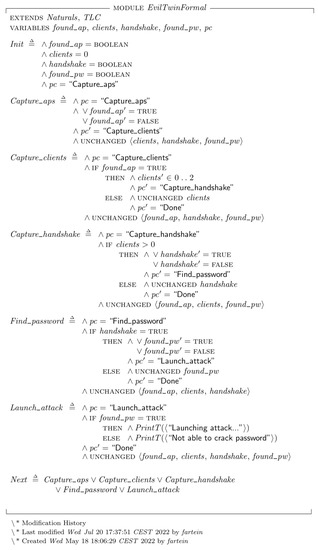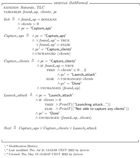 Formal specification within computer science is used to describe system requirements and function through abstraction and mathematics [43]. This is useful to aid with the design and testing of the system before, during, or even after development. Formal specification can reduce redundant and ambiguous specifications and facilitate the development of more effective code with less errors [44]. While code verification like unit tests can demonstrate that code modules work as intended, the tests may not detect logical flaws in the system design. By abstracting the software and its elements, developers can verify that the proposed design works as intended before writing the code and its details. The EP model can and should be formally verified to ensure that its logic is correct and the final states can be reached. For the purpose of verifying the EP model within this work, the formal specification language called TLA+ (Temporal Logic of Actions) [45] will be used. TLA+ is a formal specification language developed by Leslie Lamport for use in the design and verification of distributed systems. It is a high-level language that allows users to describe the behavior of a system in a precise and unambiguous way. There are several reasons why TLA+ may be considered better than other formal specification methods:
