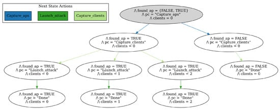 A formal model written in TLA+ is called a specification [45]. The specification is a mathematical interpretation and abstraction of the discrete events of a system, which, in this case, will be the decision making process of the agent. The fundamental elements of a specification are the states. A state describes the variables of a system at a specific point in time during system operation. The transition from one state to the next is often what would be described as a program event. In TLA+, this transition is called a step. The full system execution will be represented by a specific sequence of states where the first state is the init state. The init state represents the initial condition, and all successive steps must adhere to the rules described by the next-state relation. A state explosion [46] is a phenomenon that occurs when the number of possible states in a formal model becomes too large to be manageable. It can be a major challenge when it comes to analyzing and understanding complex systems. One way to tackle state explosions in formal models is to use abstraction techniques [47], which involve simplifying the model by ignoring certain details that are not essential to the problem at hand. This can help to reduce the number of states and make the model more tractable. Another approach is to use heuristics, which are rules of thumb or shortcuts that can help to guide the analysis of the model. Heuristics can be useful in identifying key features or trends in the data and can help to reduce the complexity of the model. Other methods for tackling state explosions in formal models include using automated tools, such as model checkers and theorem provers, to analyze and verify the model, and applying machine learning techniques to learn from data and make predictions about the model. We used the TLC Model Checker to evaluate all possible states that can be reached beginning in the init state. The state transition diagram displays all reachable states as nodes, while their sequence is described by directed edges between them.