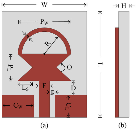 Geometry of the proposed antenna: (a) front view; (b) side view L = 20 mm; W = 15 mm; CL = 5.5 mm; CW = 6 mm; g = 0.5 mm; F = 2 mm; D = 2 mm; H = 0.254 mm; PL = 5 mm; Pw = 13 mm; Ls = 2.5 mm; R = 4.5 mm; s = 1.5 mm; θ = 90°.