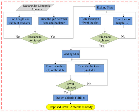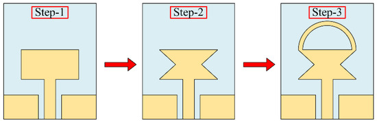 The design methodology of the proposed flexible UWB antenna is shown in Figure 6. The antenna can be summarized as the following three steps: