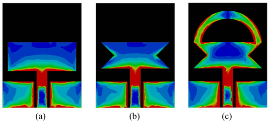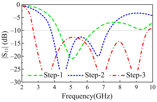 The addition of extra impedance due to the insertion of the stub provides a good match with the transmission line and results in more current flow through the surface of the antenna, which consequently increases the impedance bandwidth of the antenna, as depicted in Figure 3. From Figure 4, it can be seen that with each modification, the more current induced in the radiator causes the resonance at the selected frequency, thereby eventually increasing the bandwidth of the proposed antenna. The final antenna after optimization has a wide |S11| > −10 dB impedance bandwidth at 6.95 GHz ranging from 2.73–9.68 GHz, as illustrated in Figure 3.