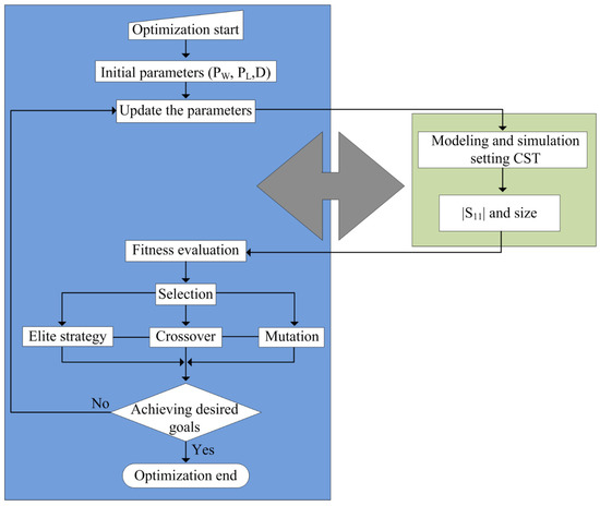 The generic value of various parameters, including the length and width of the monopole antenna, along with CPW-feeding parameters as well as the impedance of the stub, can be estimated by various equations. However, due to the presence of various materials and connector losses, these values must be optimized to achieve the desired results. In the literature, various optimization techniques were used. However, due to its ease of use and lustiness, the CST Genetic Algorithm (GA) is utilized. Figure 5 depicts the working flow chart of the GA. The detailed description and working methodology of the GA are fully explained in [31].