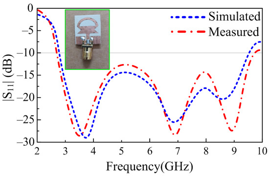 In order to substantiate the theoretically proven results, a prototype of the antenna was fabricated using a standard chemical etching process. A gold-plated SMA connector having an impedance of 50 Ω is utilized for excitation of the antenna, as depicted in Figure 7. The reflection coefficient of the proposed UWB antenna is measured using an E5063A Vector Network Analyzer (VNA) by KEYSIGHT Technologies, with a maximum frequency range of up to 18 GHz. Figure 7 provides the comparison between theoretical and measured results; it can be observed that the measured results are in good agreement with the simulated results. The measured results offer an UWB of 7.05 GHz, which is 140% of the initial central frequency of 5 GHz. The proposed work, as shown in Figure 7, provides |S11| > −10 dB impedance bandwidth ranges from 2.70–9.75 GHz.