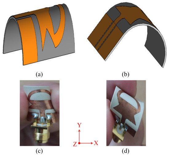Simulation setup for conformal structure (a) X-axis (b) Y-axis; fabricated prototype of the proposed antenna bent along (c) X-axis (d) Y-axis.