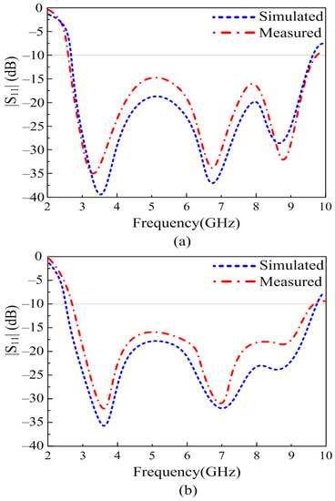 However, due to the size limitation of the antenna, further variation was not possible, and the optimized antenna offers a broadband of 4.23–6.64 GHz, as illustrated in Figure 3. In order to broaden the bandwidth of the radiator even further, truncating the corners of the radiator is utilized. Various techniques, including etching slots [27], inserting vias [28], and loading open-ended stubs [29], are widely studied to achieve wide bandwidth. However, etching slots requires a bigger radiator, inserting vias requires a ground plane at the back of the radiator, and open-ended stubs require more space. Therefore, instead of utilizing conventional techniques, the truncated corner technique is exploited. Furthermore, rather than truncating the corners of the radiator as utilized in [8,10,28], the sides of the radiator are truncated by using a triangular-shaped structure, as depicted in Figure 2. The variation in the shape of the radiator due to the etched slot causes the flow of current to redistribute itself across the surface of the radiator, and with optimization, it results in the generation of a wide band ranging from 3.8–7.35 GHz, as depicted in Figure 3.