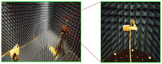 The fabricated prototype is further utilized to measure the far-field parameters of the proposed work. In order to this, the antenna was placed inside the anechoic chamber in front of the reference Horn antenna, which has a broadband of up to 12 GHz. The measurement setup, along with a close snap of the proposed work, is depicted in Figure 10.