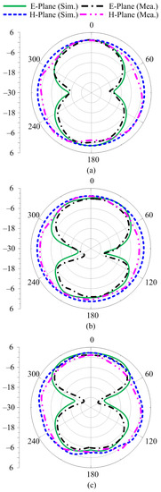 Figure 11a–c depict the radiation pattern of the proposed antenna at the selected frequencies of 3.5 GHz, 6.8 GHz, and 9 GHz, respectively. In all the selected frequencies, the antenna provides an omnidirectional radiation pattern in the h-plane, while in the e-plane, the antenna provides a monopole-like bidirectional radiation pattern. It can also be seen that as the frequency increases, the radiation pattern becomes slightly distorted, owing to the fact that the antenna size grows relatively large. Furthermore, the measured results offer a strong agreement with the simulated results over all frequencies, as depicted in Figure 11.