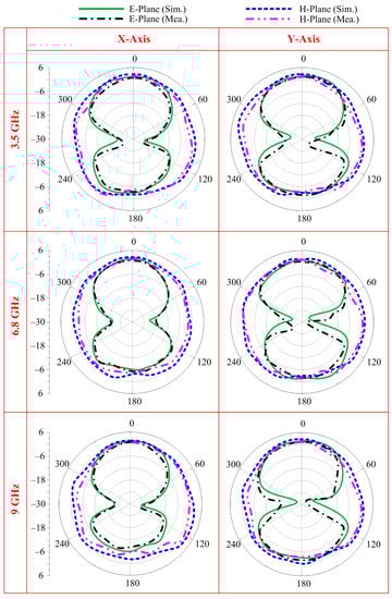 The prototype is then used to measure the radiation pattern under bending conditions. The radiation is measured at the selected frequencies of 3.5 GHz, 6.8 GHz, and 9 GHz while bending the antenna along the x- and y-axes, as shown in Figure 12. It can be observed that at all selected frequencies, the antenna offers a nearly identical radiation pattern as compared to the antenna under normal conditions. A little deviation from the original pattern is due to conformability in the radiating structure. Moreover, the simulated and measured results also show strong agreement with each other, stating the performance stability of the proposed antenna in terms of radiation pattern.