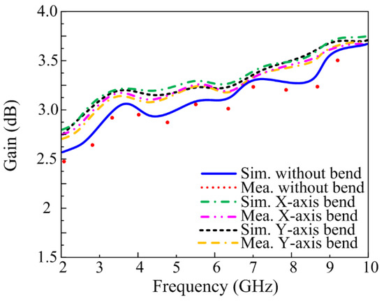 Table 1 presents the comparison of the proposed antenna with the state-of-the-art. It can be observed from Table 1 that the antenna reported in [13,14,15,16,17,18,19,20,21,22] offers a bigger size as compared to the proposed work, while the antenna reported in [13,14,15,16,17,18,19] also offers structural complexity. Moreover, the antenna reported in [14,15,16,17,18,19,22] exhibits low gain as compared to the presented work. Therefore, it can be concluded that the proposed work over-performs the related work by offering a good combination of compact size, wideband, moderate gain, low structural complexity, and strong comparisons among simulated and measured results in both rigid and bending conditions.